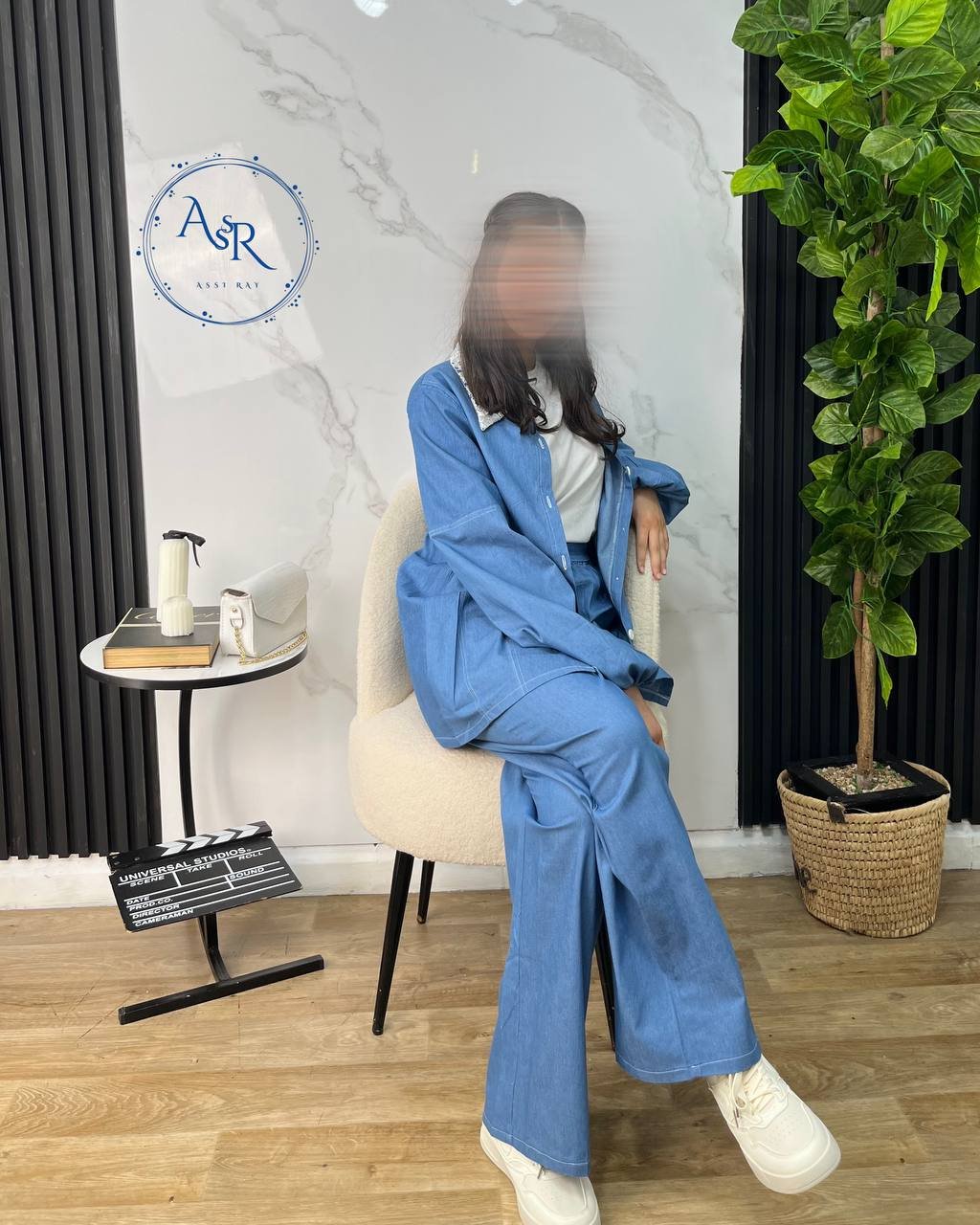 Couleur principale : Bleu jean clair, uni, qui évoque une touche casual mais soignée.